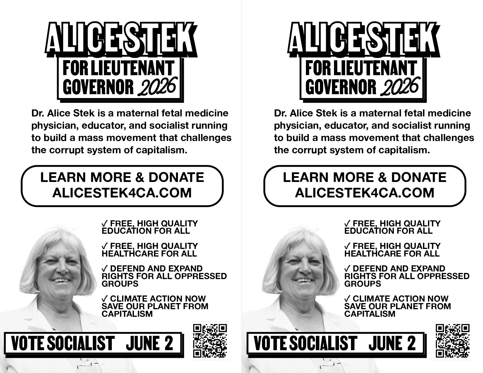 Dr. Alice Stek is a physician, educator, and socialist who has served on the front lines of California’s healthcare system for over 32 years. As an Obstetrician, Gynecologist, and an HIV specialist, she has treated the most vulnerable patients and witnessed first hand how our political and economic systems fail the working class. This daily reality solidified a conviction she has held since her youth: that socialism is the only cure to the ailing system of capitalism.